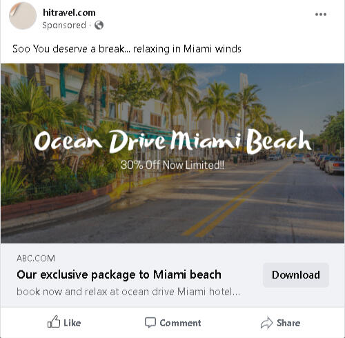 This ad promotes a travel package in Ocean Drive Miami Beach which is approx 2500$ according to calculations. This ad will boost your package sales well and with the insight-driven targeting and proper use of Facebook ad tools This ad can make up to 20x and up to 100x or more (Depending on the ad spend in this calculation I've set a budget to 400$ to 500$ ) which results in approximately 10,000$ to 50,000$ and more, and this is not an estimate or a guess this is Facebook insights driven study and ad insights calculation